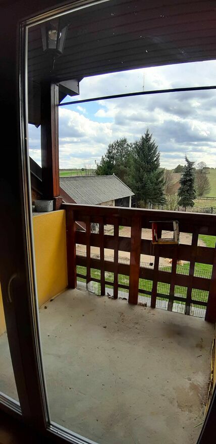 -duży salon z aneksem kuchennym i wyjściem na południowy balkon z widokiem na podwórko i okoliczne pola i lasy,